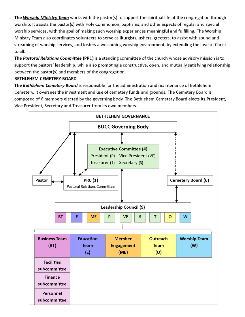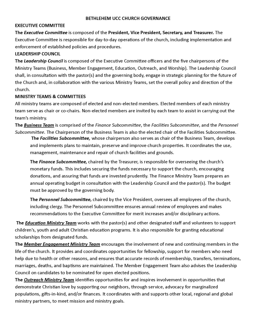 The governing body of Bethlehem United Church of Christ is the membership of the church. The vote of a majority of the members is considered the will of the church.