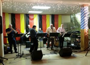 A picnic-style dinner of brats, hotdogs German potato salad, Spatzen, sauerkraut, chips desserts, beer and wine (for sale), coffee, water and lemonade. Live music is provided by our very own Stevie D and the Wannabes.
